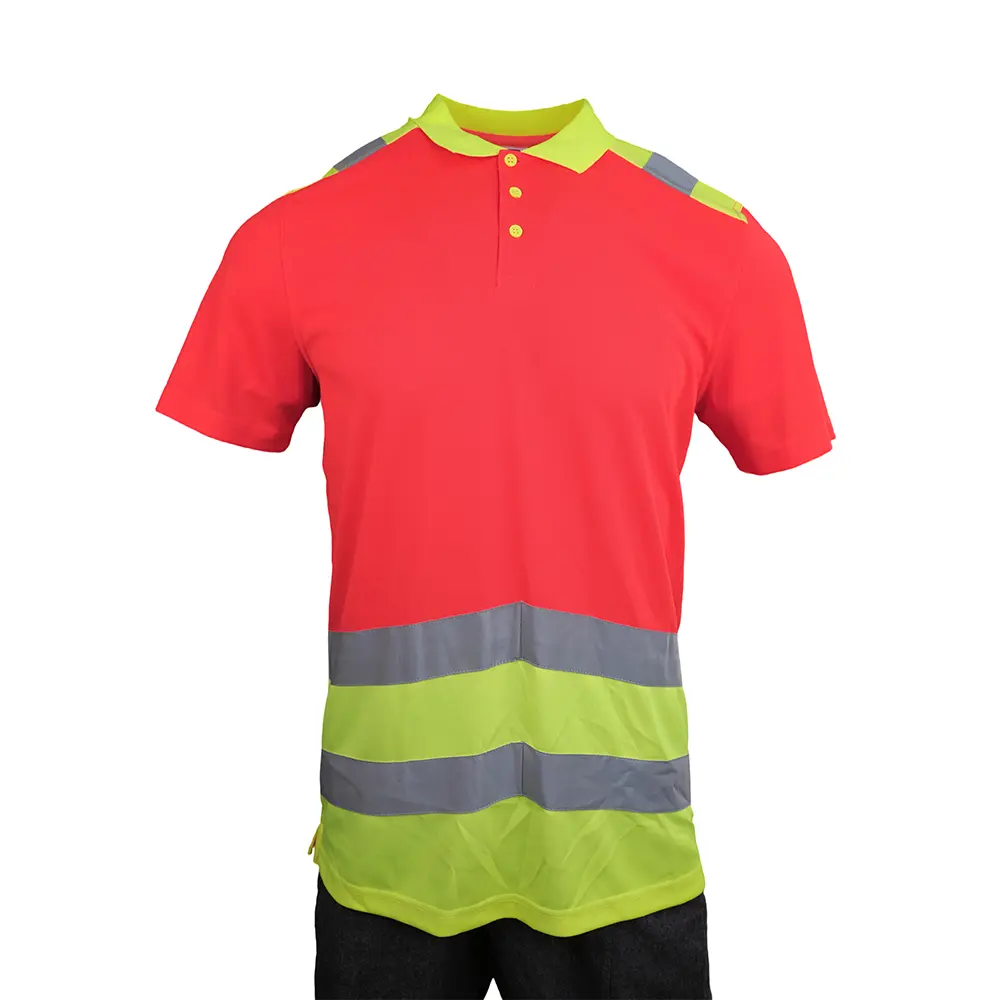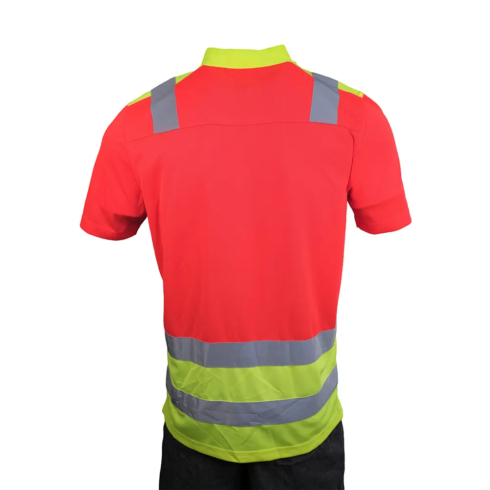This fluorescent-colored POLO shirt is made of a breathable fabric of 180 grams per square meter (50% polyester fiber / 50% CoolDry bird-eye knitted fabric), which can quickly drain sweat and ensure comfort. The eye-catching fluorescent contrast design, with reflective strips on the collar, shoulders and body parts, provides comprehensive visual protection. There are 360° reflective stripes on the shoulders, sleeves and unique V-shaped cuffs. The elastic fabric fits the body shape, and the side slits on the hem enhance the freedom of movement.