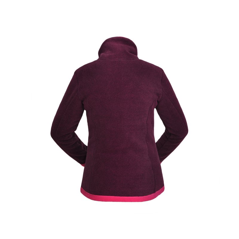 This women’s outdoor jacket is made of 100% polyester fleece fabric, which is warm and soft. The main color is deep purple red, paired with pink, creating a fashionable color contrast. The stand-up collar design and the diagonal pocket enhance the windproof functionality, making it suitable for various outdoor activities.